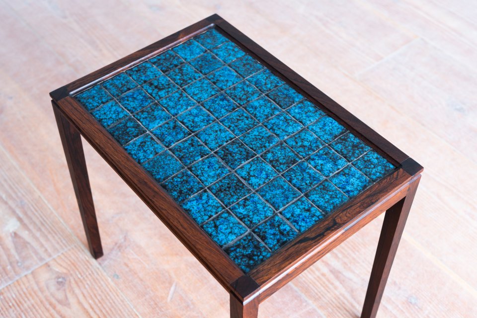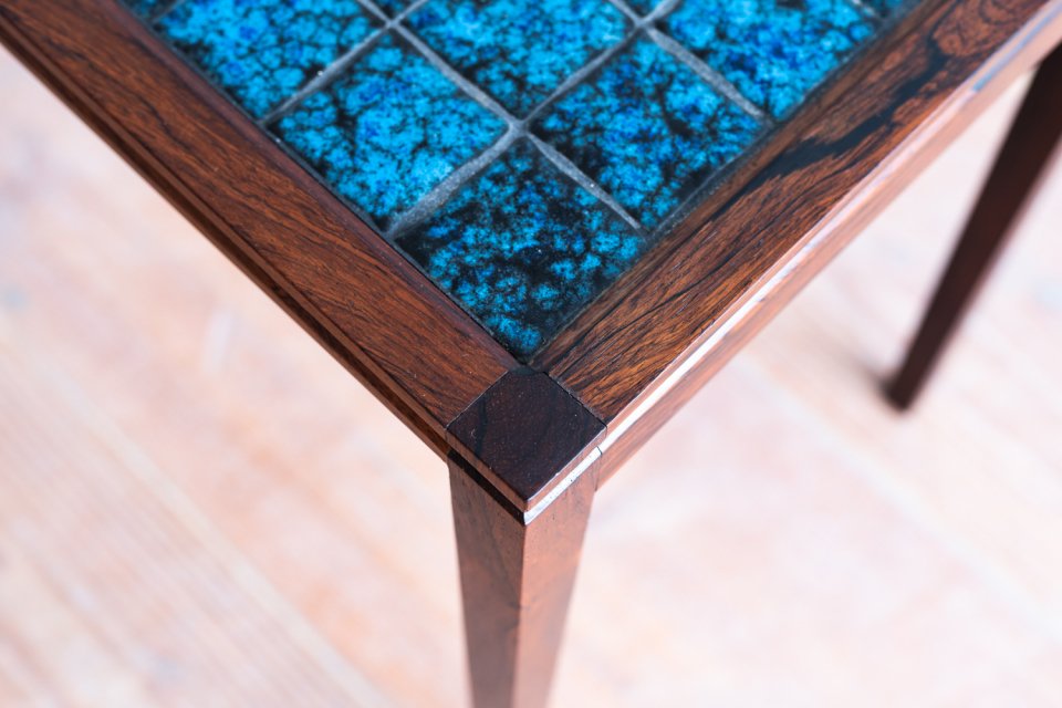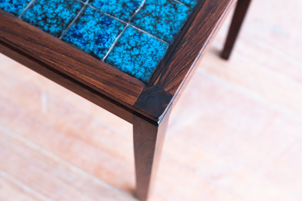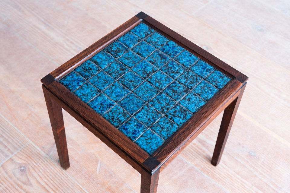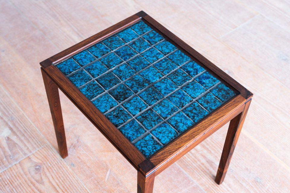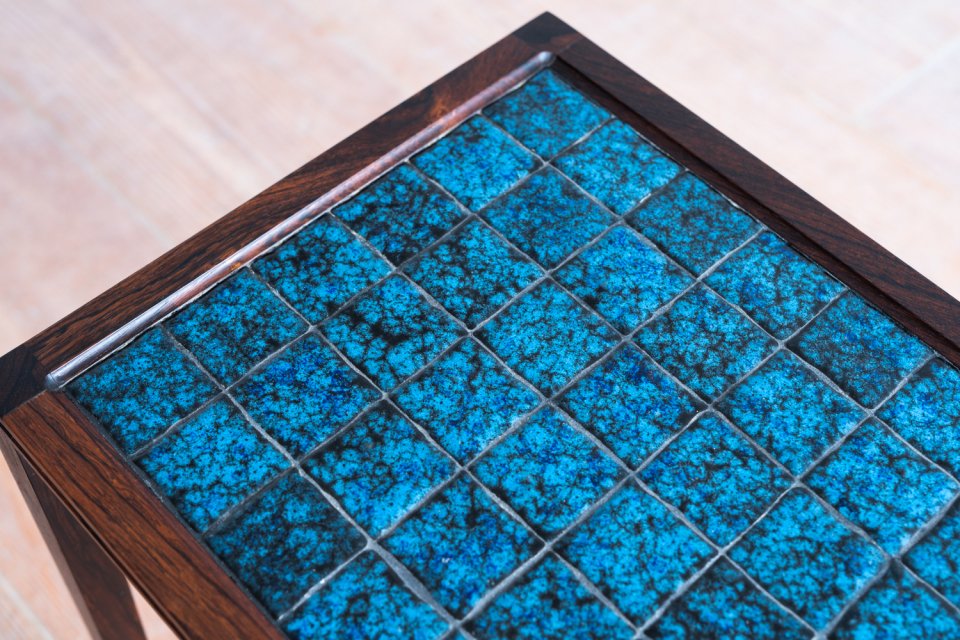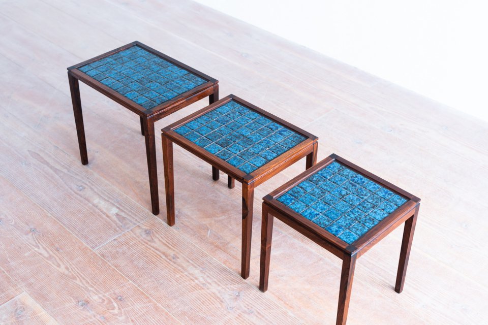 3台のテーブルが一つに納められた際、それぞれが僅かにオフセットされるように 設計がなされており、すべての天板に施されたブルーのタイルが顔を覗かせるその様は、 なんとも惚れ惚れしてしまいます。