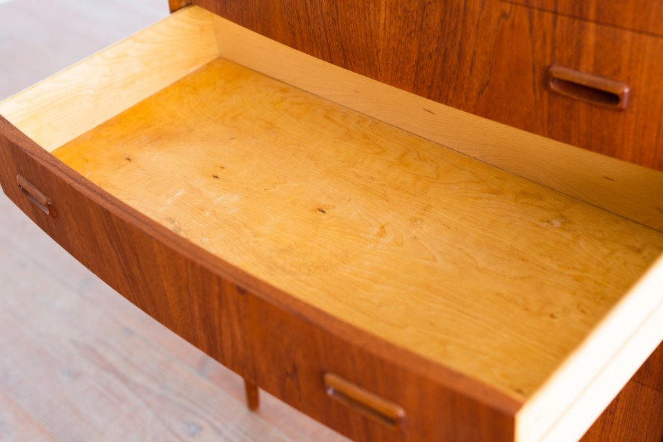 手を掛けやすく削り込まれた抽斗は、内部にたっぷりと衣類を入れた時こそ真価を発揮して するするとスムーズに動作をしてくれる。