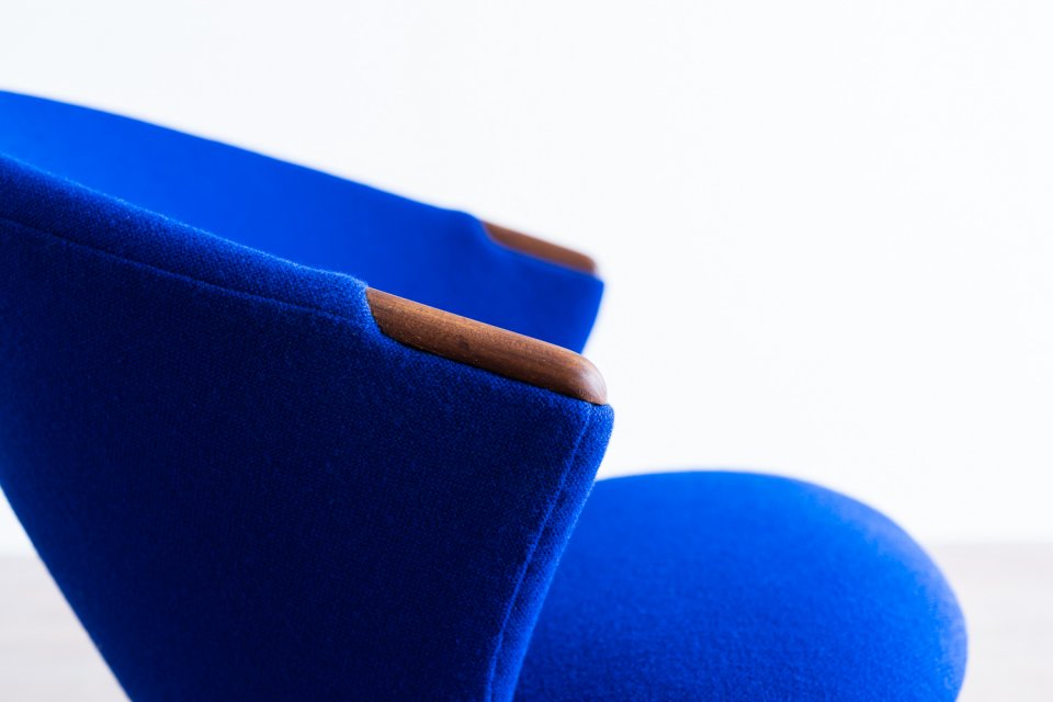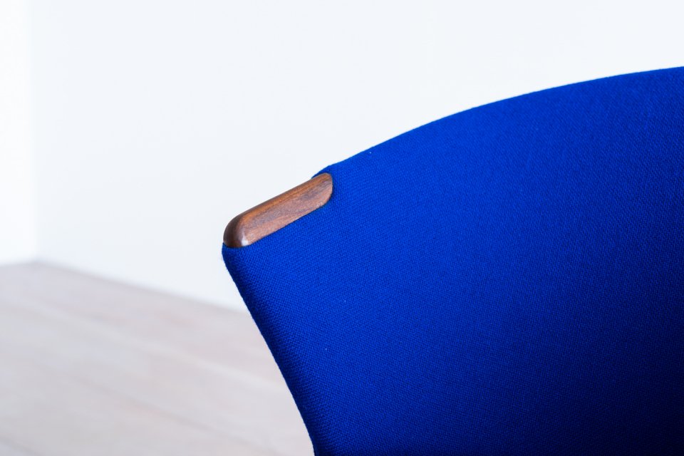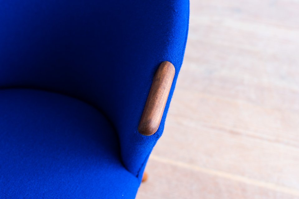 ふっくらとオーガニックなシルエットと、ひょこっと顔を覗かせるチークのアームは ファブリックとのコントラストが美しく、このチェアのキャラクターを際立たせています。