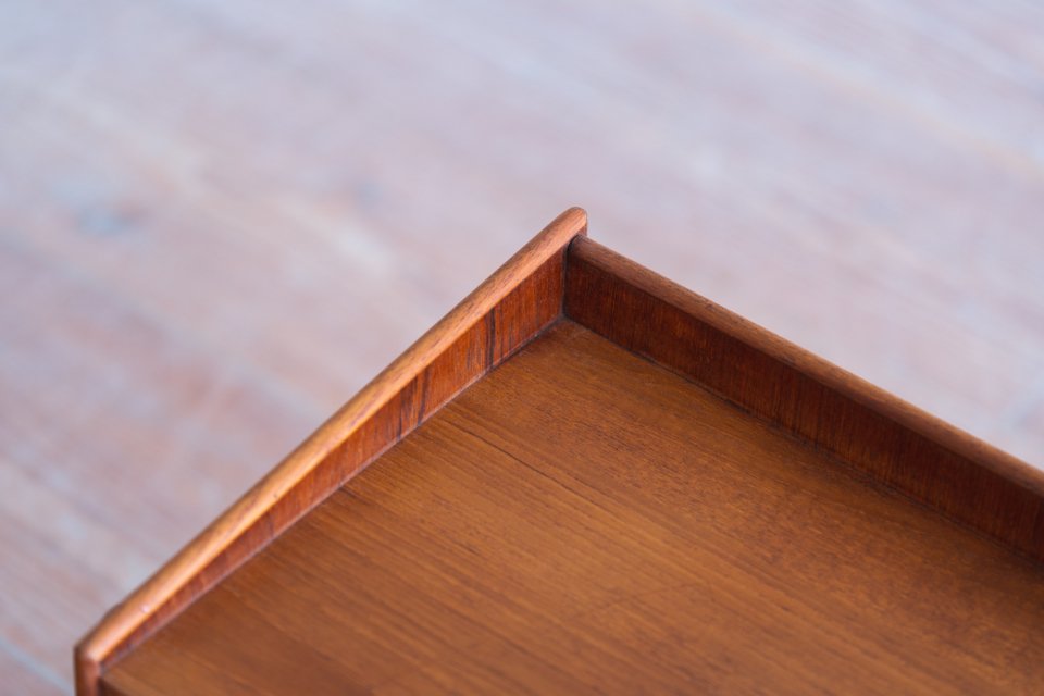 ベッドサイドテーブルや、ナイトテーブルとも呼ばれるこちらは ボーエ・モーエンセンによりデザインされ、Soborg Mobelfabrikで製作されていたモデル。 本体収納にのめり込んだような脚部のデザインが目を引く逸品です。