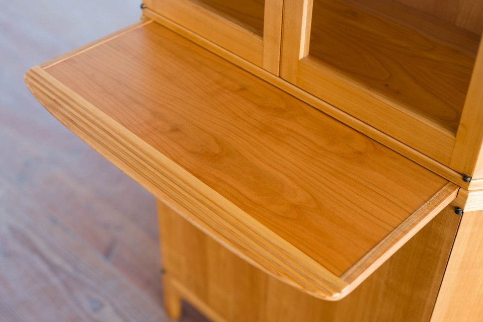 格納式の作業天板がそれをつぶさに物語っており、中に収納されたグラスなどを選定し、 サービングするまでの流れをスムーズにする事を確実に考えつつ、家具本体の美観に配慮して 備えられたそれに使い手への配慮を感じずにはいられません。