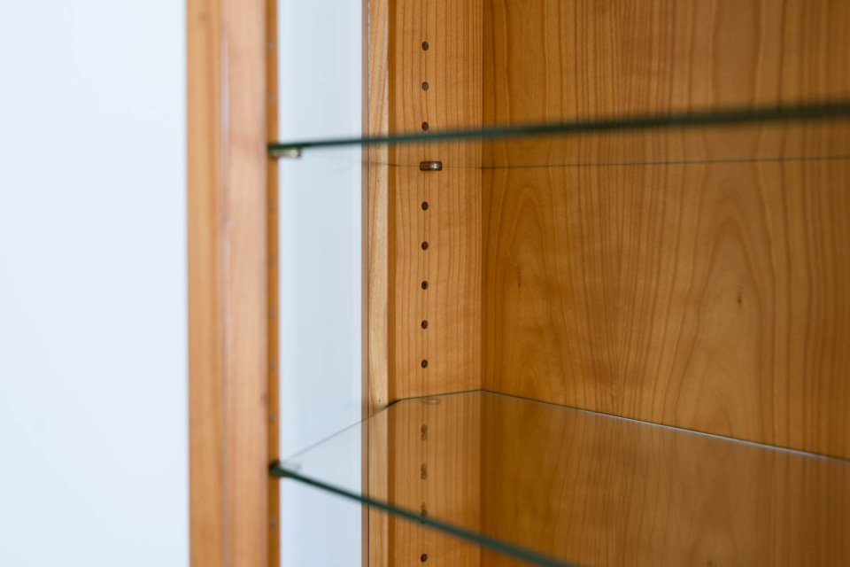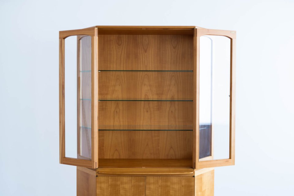 そんな彼がデザインした中では、少しクラシカルな要素が多く垣間見えるこちらは、飾りつつ あくまで使うものの収納を考えたとしか思えない仕込みが憎いガラスキャビネット。