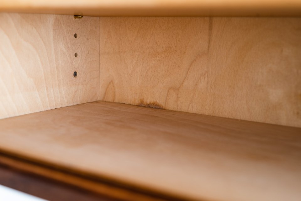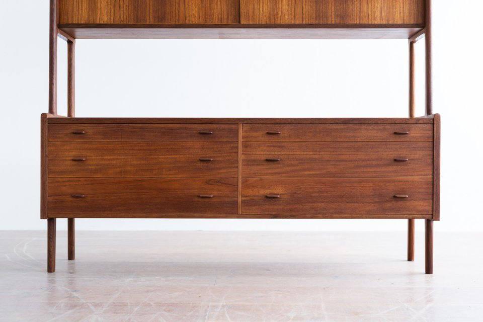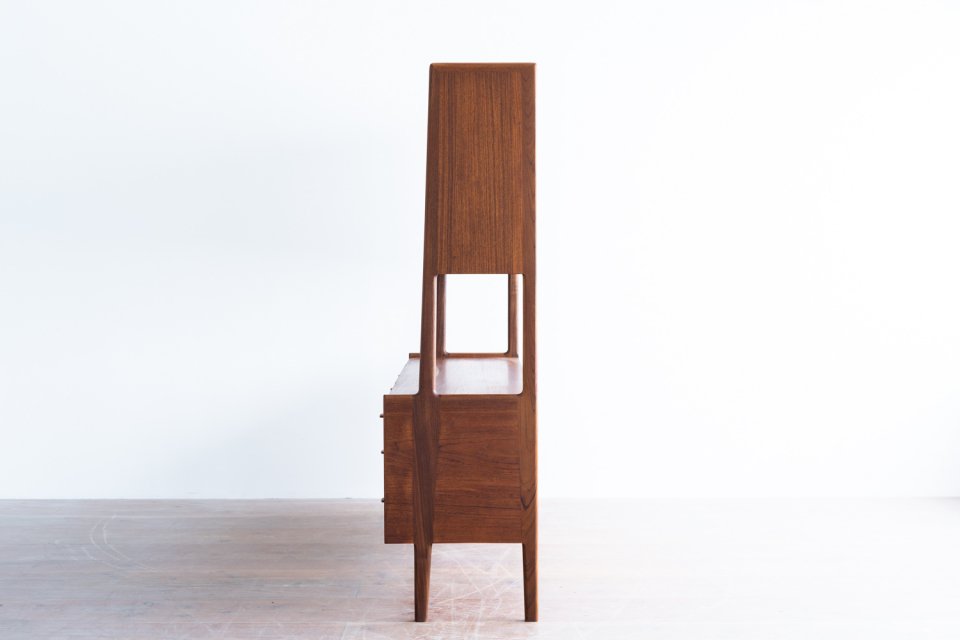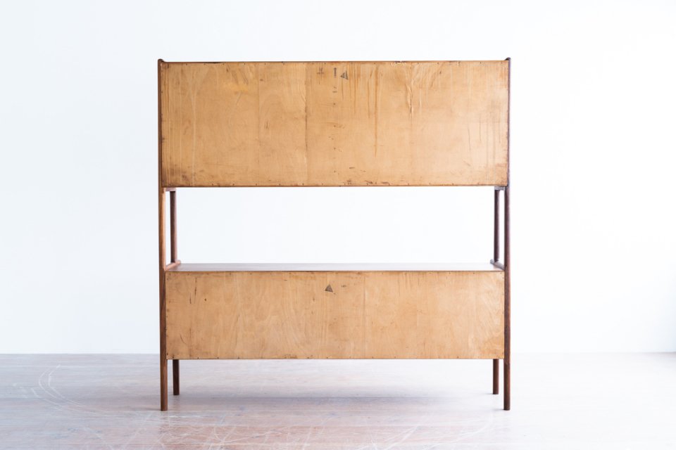 上段、下段の収納部を脚部パーツにより支えるというスタイルは 当時のキャビネットメーカーが時折チャレンジした構造ですが、 このモデルに関しては少し違う。