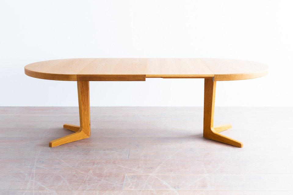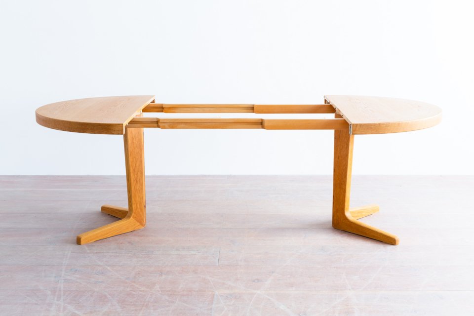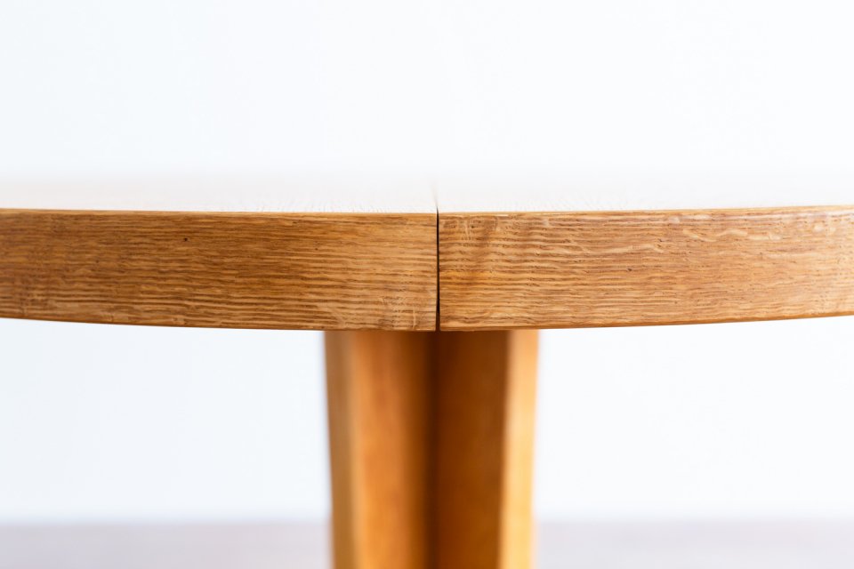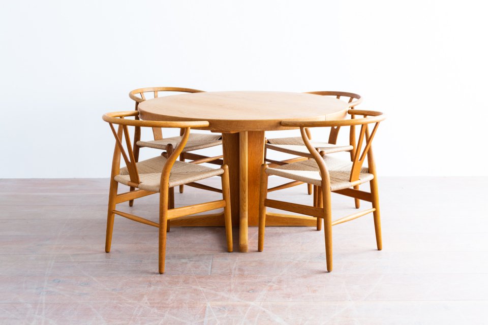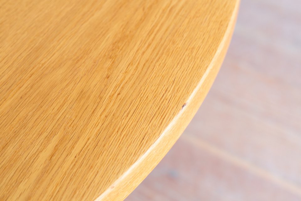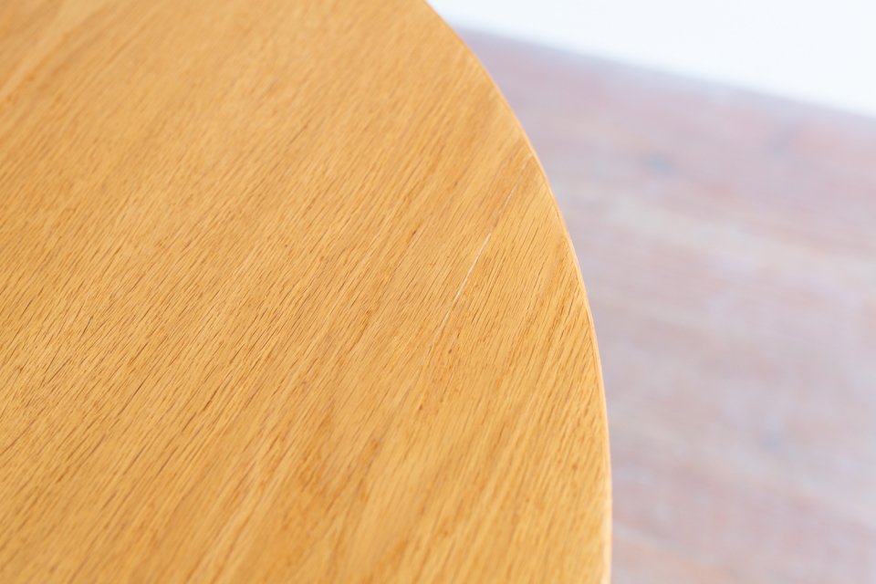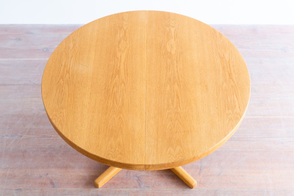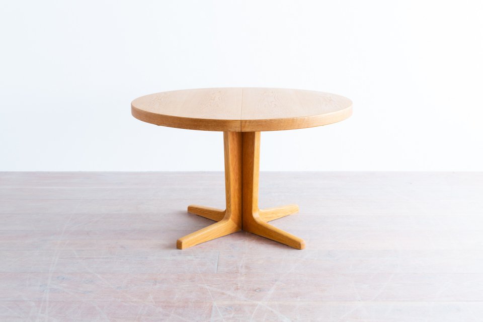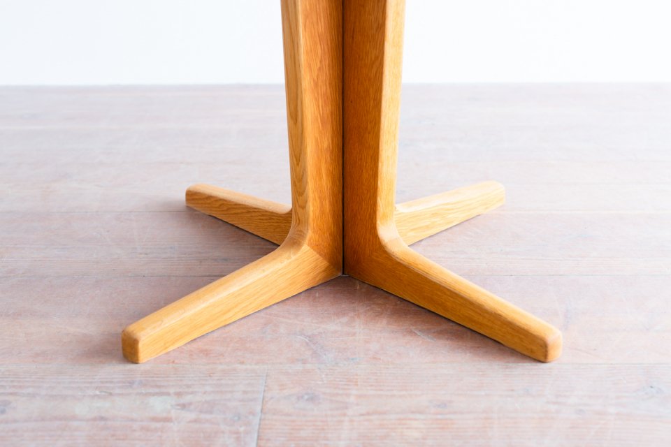 こちらは流通の少ないオーク材のラウンドテーブルで、センター型のレッグと端正に整えられた天板の美しさが目を惹く、クオリティの高い一台。