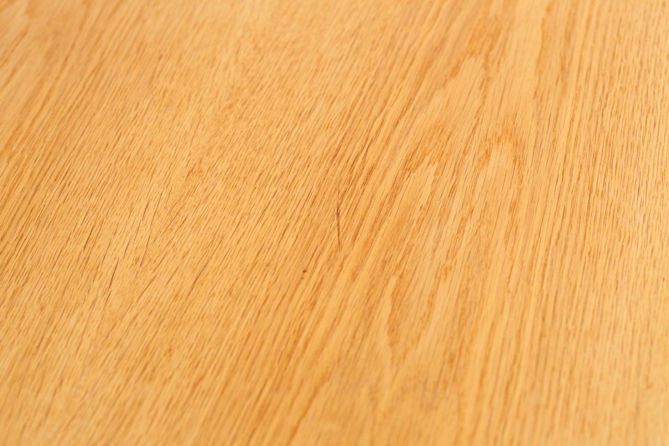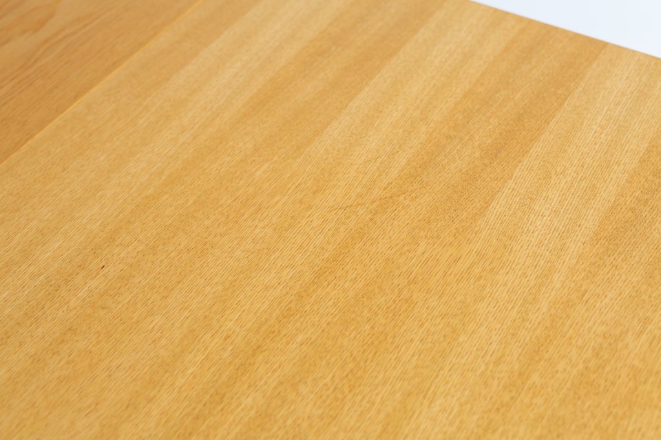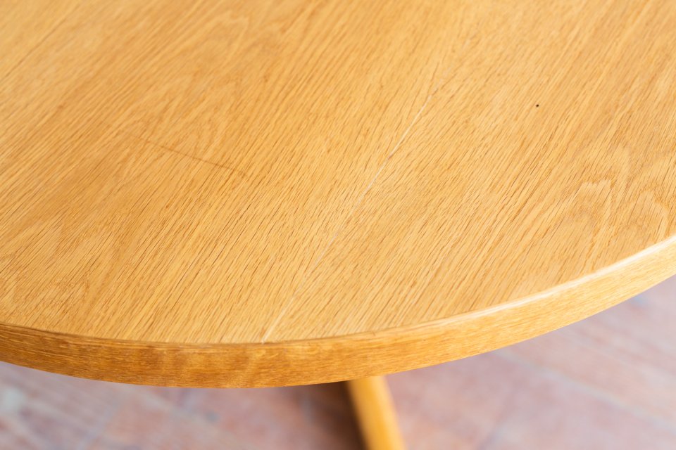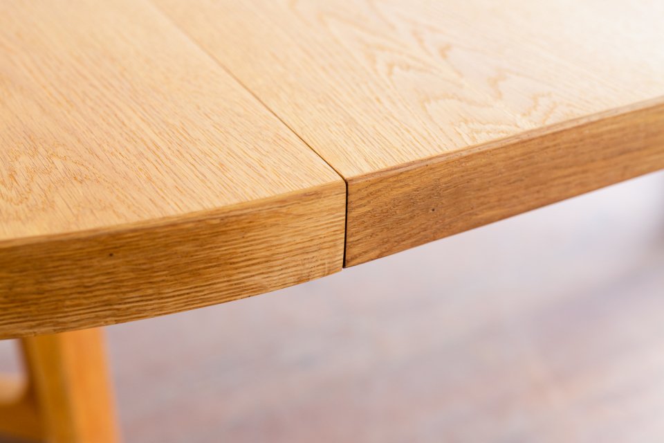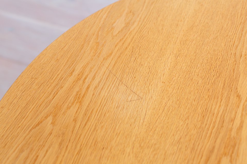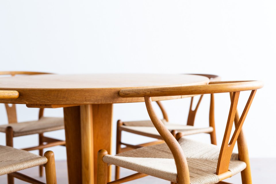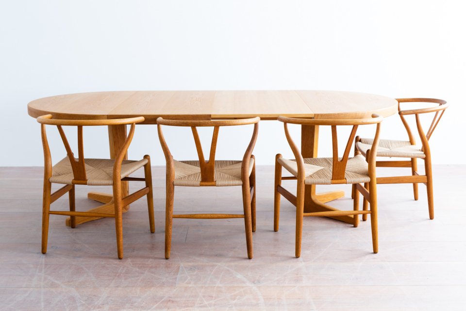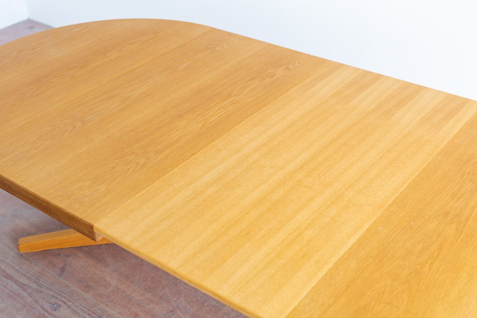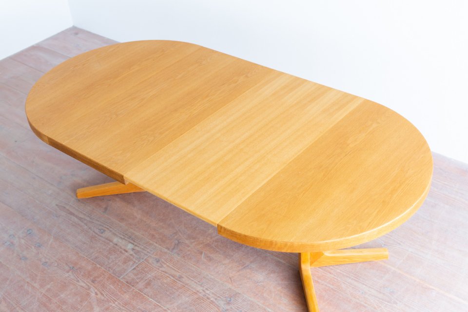 こちらは流通の少ないオーク材のラウンドテーブルで、センター型のレッグと端正に整えられた天板の美しさが目を惹く、クオリティの高い一台。