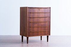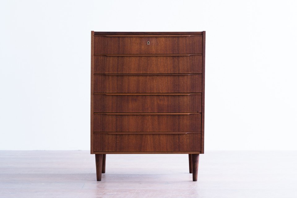 北欧ヴィンテージのチェストといえば、小間物を整理するのに重宝するスモールチェストから 大容量の7段チェストまで様々なバリエーションがありますが、こちらは定番の6段チェスト。