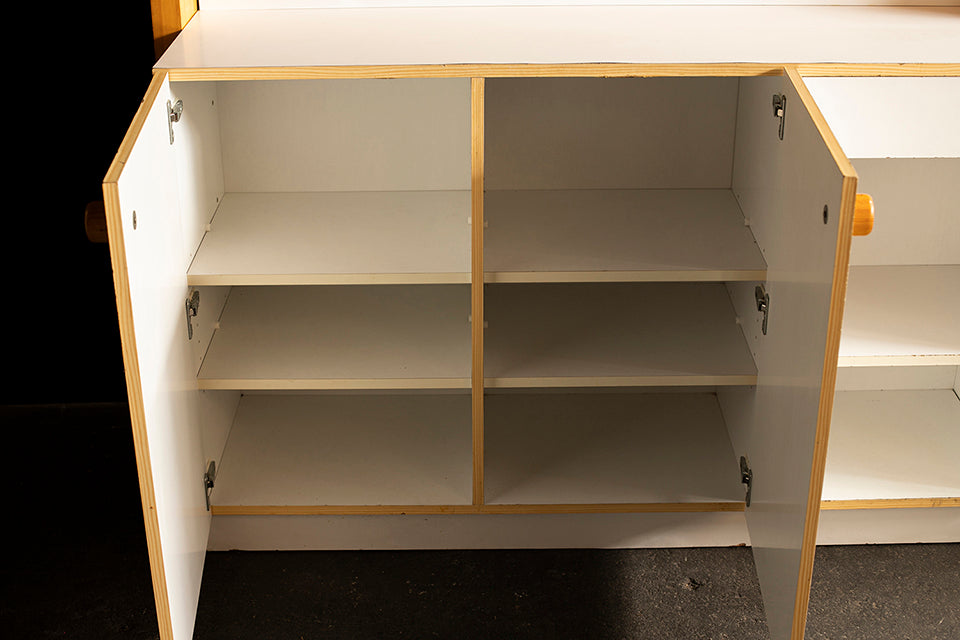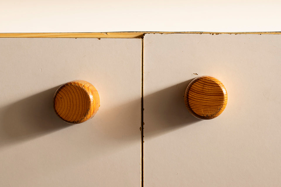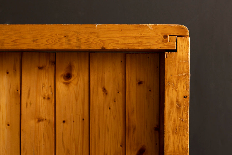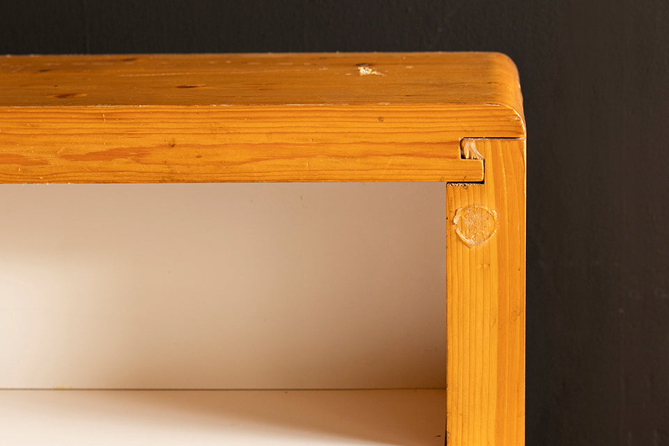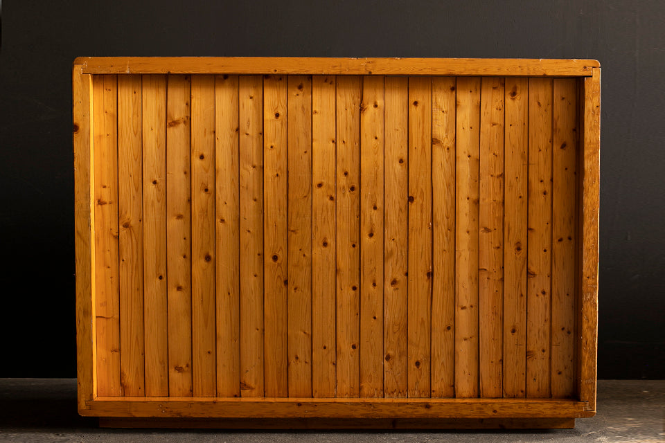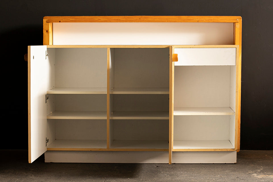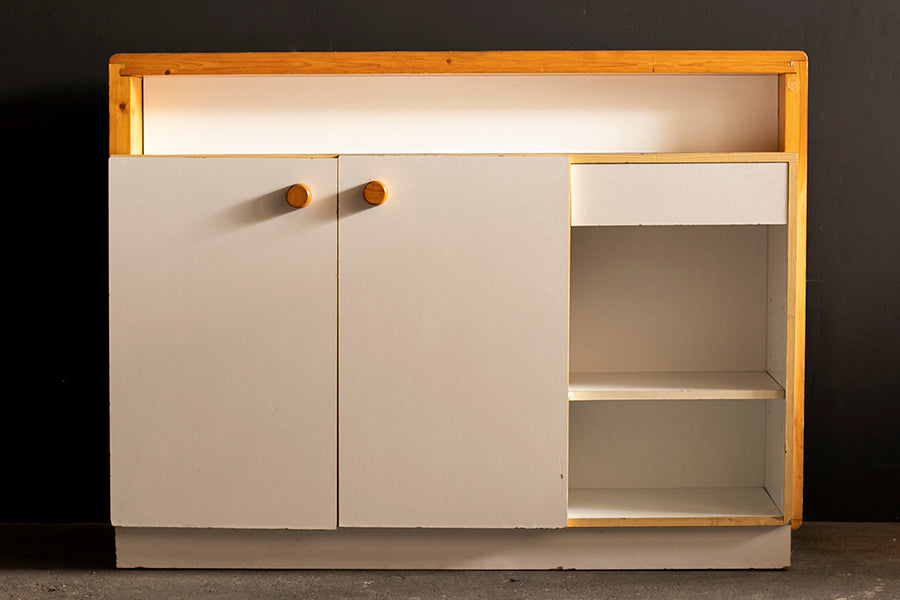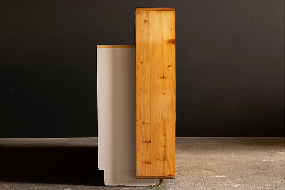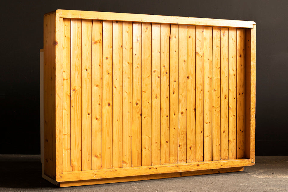 『レ・ザルク』はフランスのサヴォア県に1967年に建設された 初めての一般向けのスキーリゾート。その中の一つであるArc 1800で使用されていたバーカウンターになります。 前面が『レ・ザルク』特有のパイン材が使用されており、周囲のフレームはジャンプルーヴェの木の継ぎで構成されており、背面は特有のシャルロットペリアン デザインの取手が印象的な収納となっています。