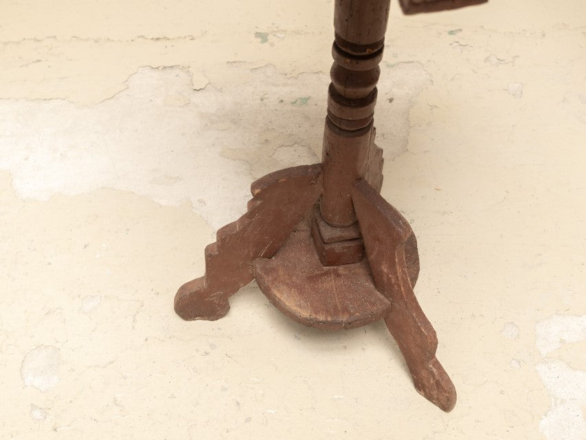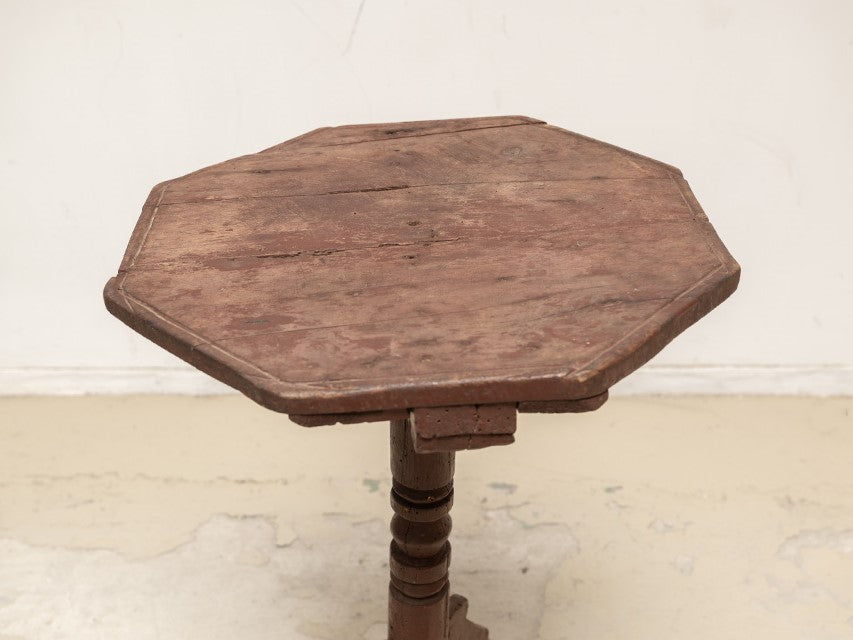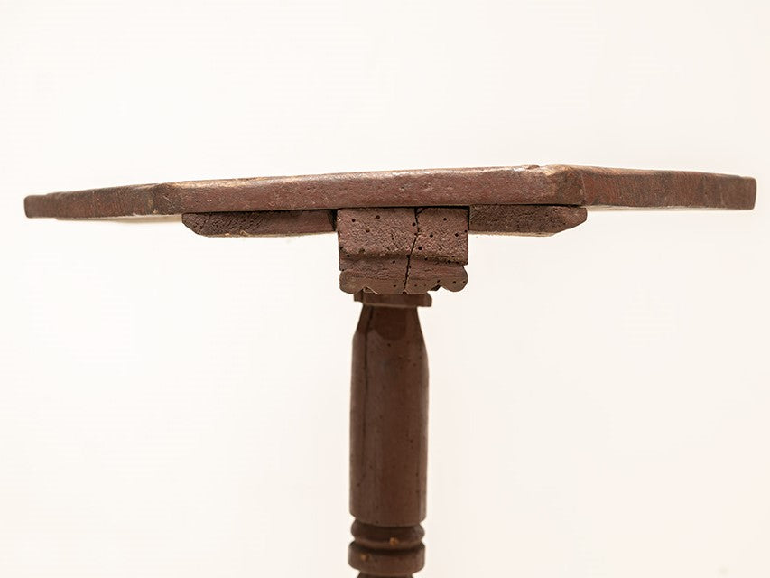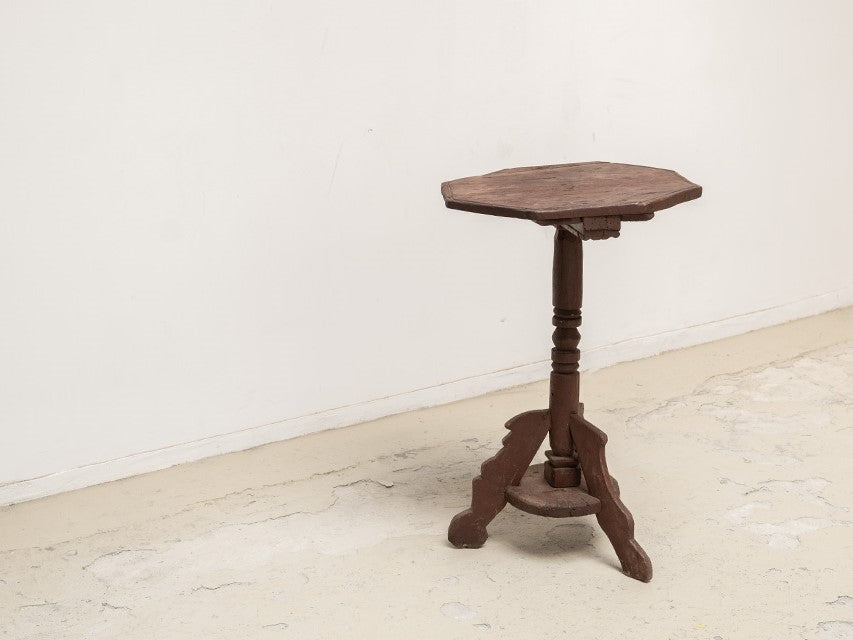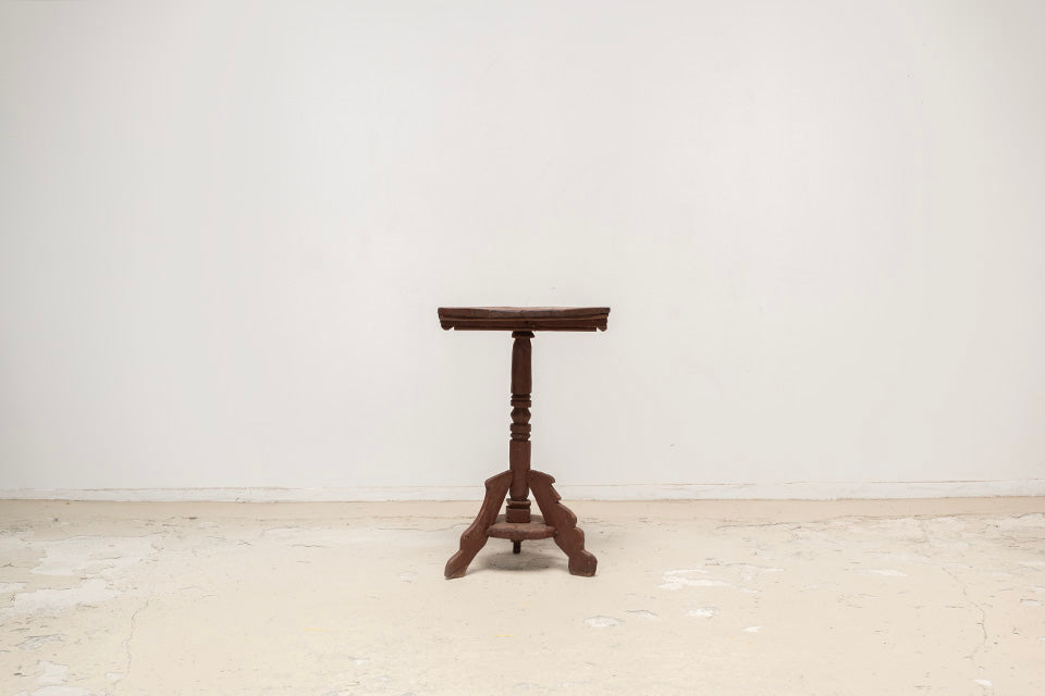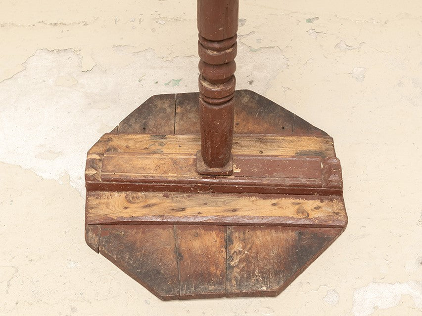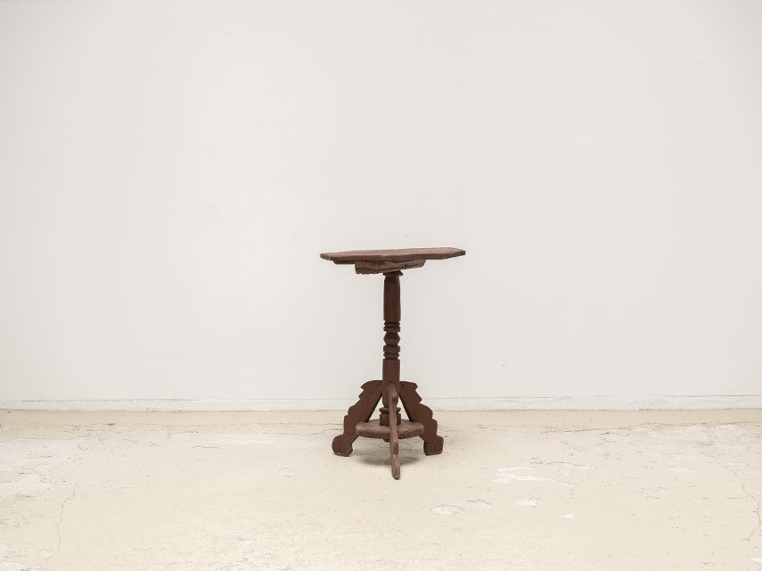 スペインからの古い3本脚のディスプレイスタンドです。 褪色した臙脂色のペイントと、アンティークらしいディテールの天板が特徴の一台。 天板の接続部分にグラつきがありますので、ディスプレイスタンドとしてのご活用を推奨しております。ご了承くださいませ。