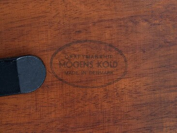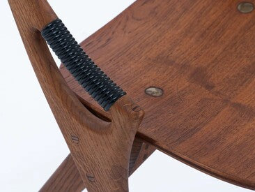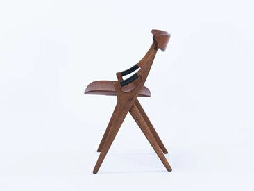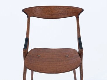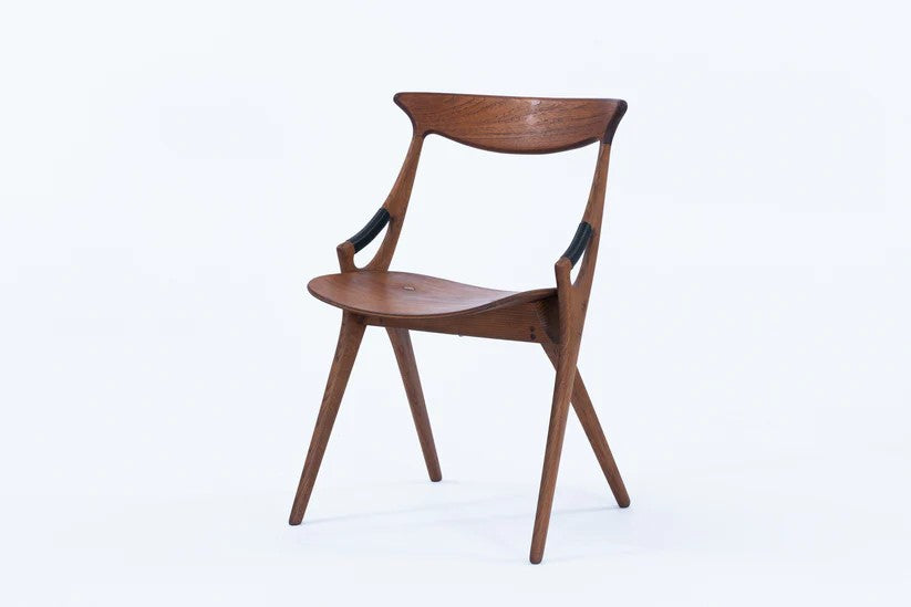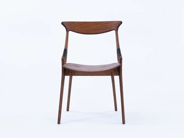 デンマークの家具デザイナー、Arne Hovmand Olsen(アルネ・ホフマン・オルセン)デザインのmodel.17ダイニングチェア。 美脚という言葉がしっくりくる華奢で流麗なプロポーションと、意外にも安定感のある座り心地にデザイナーのこだわりを感じられる一脚です。 アームには持ち手になるカバーがつき、全体の印象を引き締めるポイントに。シートに施された真鍮の留め具はヴィンテージらしさを感じる鈍い輝きを放ちます。アルネホフマンらしい曲線的かつエッジの効いた背もたれの形状を踏襲しながらも、随所にアクセントとなるデザインが散りばめられています。