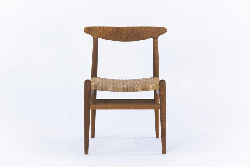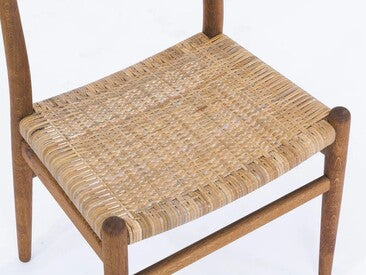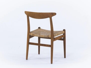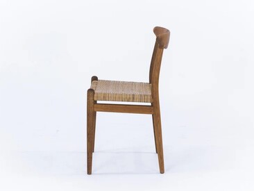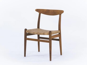 ヴィンテージ家具の中でも特に上質で美しい木の質感を楽しめるものがお好きな方にぜひおすすめしたい、Hans J WegnerデザインのW2。作りの良さで名高いデンマークの名工房、C.M. Madsen製です。 贅沢に削り出した無垢の笠木がたまらない美しさで、座るよりも触れていたいと思うような優しい角当たり。量感のあるフレームはまるでオブジェのようで、流れるような木目の美しさを引き立たせます。笠木だけでなく後ろ脚も無垢材を曲線で削り出すことで、腰から背中にかけて自然なカーブで身体を支え、シンプルな見た目以上の座り心地を実現しているのも憎い点。 座面はファブリックやペーパーコードなど様々な仕様の個体がありますが、こちらは贅沢にラタン張り。程よいハリ感と通気性が季節問わず気持ちよく腰掛けられます。ラタンは使い込むうちに色が深くなり、経年変化を楽しみながら使い続けられるヴィンテージ好きにはこの上ない仕様。 シンプルで上質であることにおいてこれ以上はない、少し背伸びしてでも迎え入れたい一脚です。