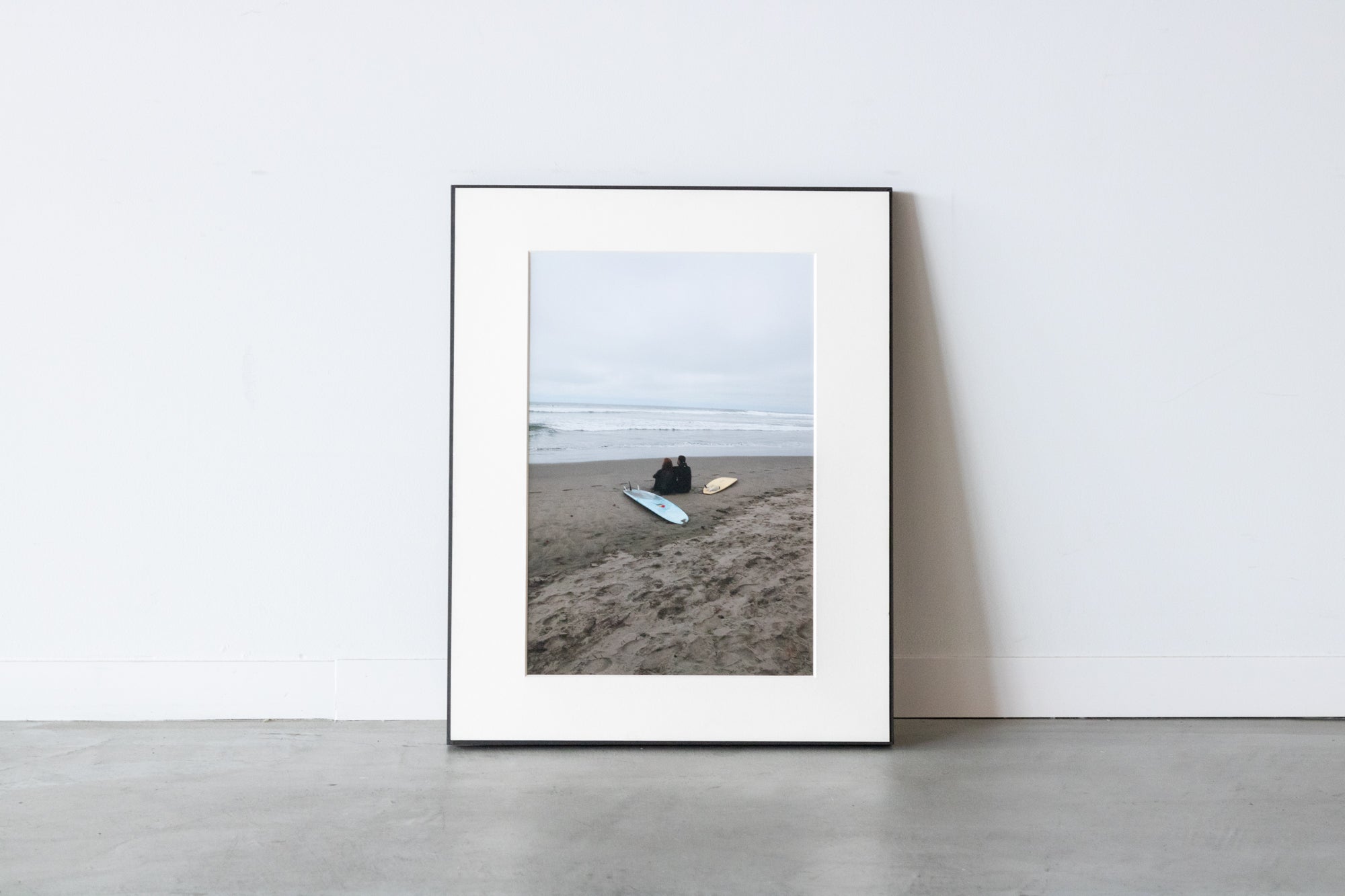 水平線を前に、砂浜で静かに佇む2人のサーファー。