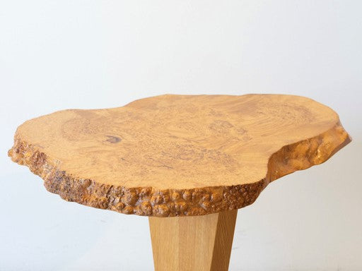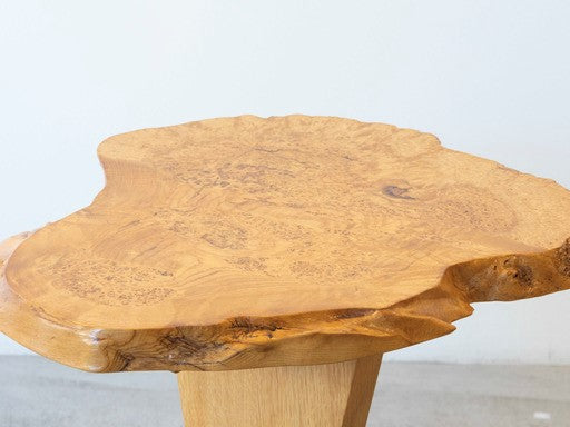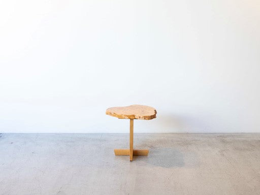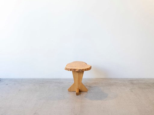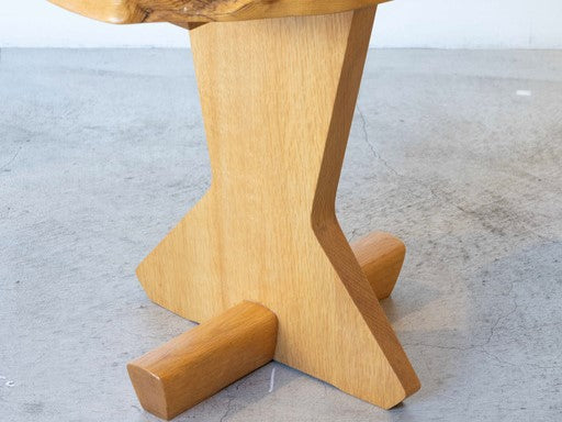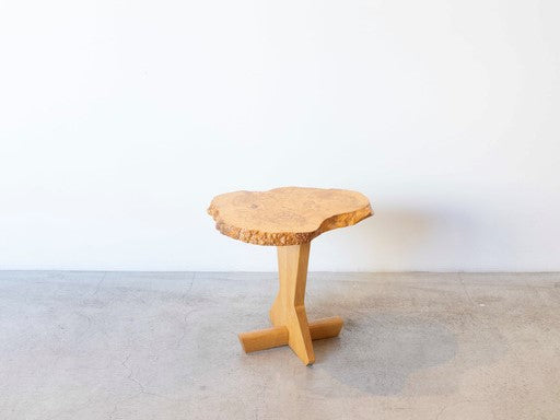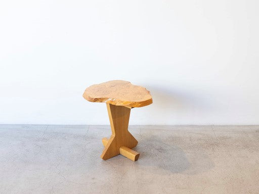 十字の組脚構造で、伐採時の樹皮を剥いだままの 自然の形を縁にとどめたエンドテーブル。 オダキュウクッションと同じく、1968 年からナカシマの家具を日本に紹介した、小田急百貨店ハルク別館に因んで命名されました。 ナカシマの娘のミラと、孫娘マリアによってデザインされました。 コンパクトながらも、木から木の力強さを感じるテーブルです。 桜製作所にてメンテナンスが施されています。